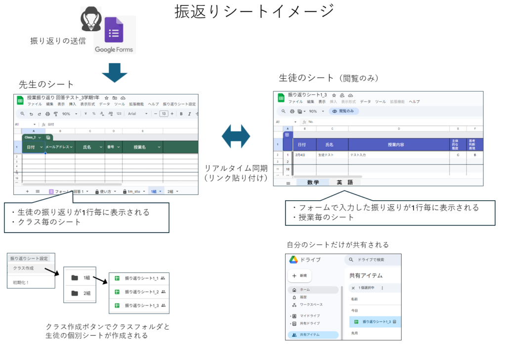 フォームの送信内容は、フォームの回答シートに自動入力されますが、生徒の個別シートへの転記はリアルタイムのリンク貼り付けにしました。