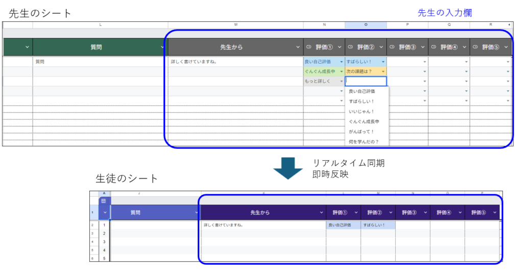 - 一覧シートから生徒へ評価、メッセージを入力出来る